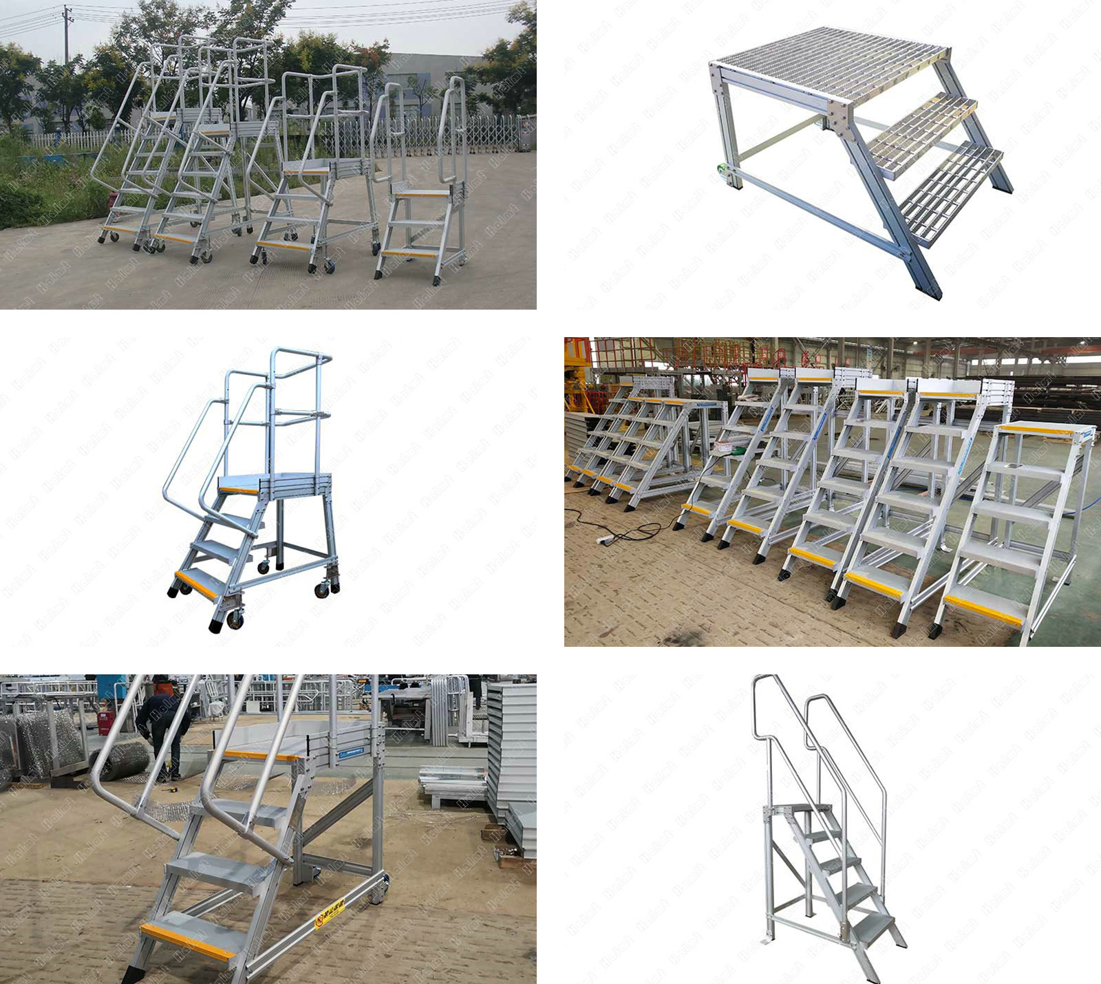 鋁合金踏臺,一般設(shè)置踏步2級到5級,平臺高度約1m-1.5m,支腿側(cè)配備兩滾輪或采用支架固定到地面,轉(zhuǎn)場運輸快捷輕便。